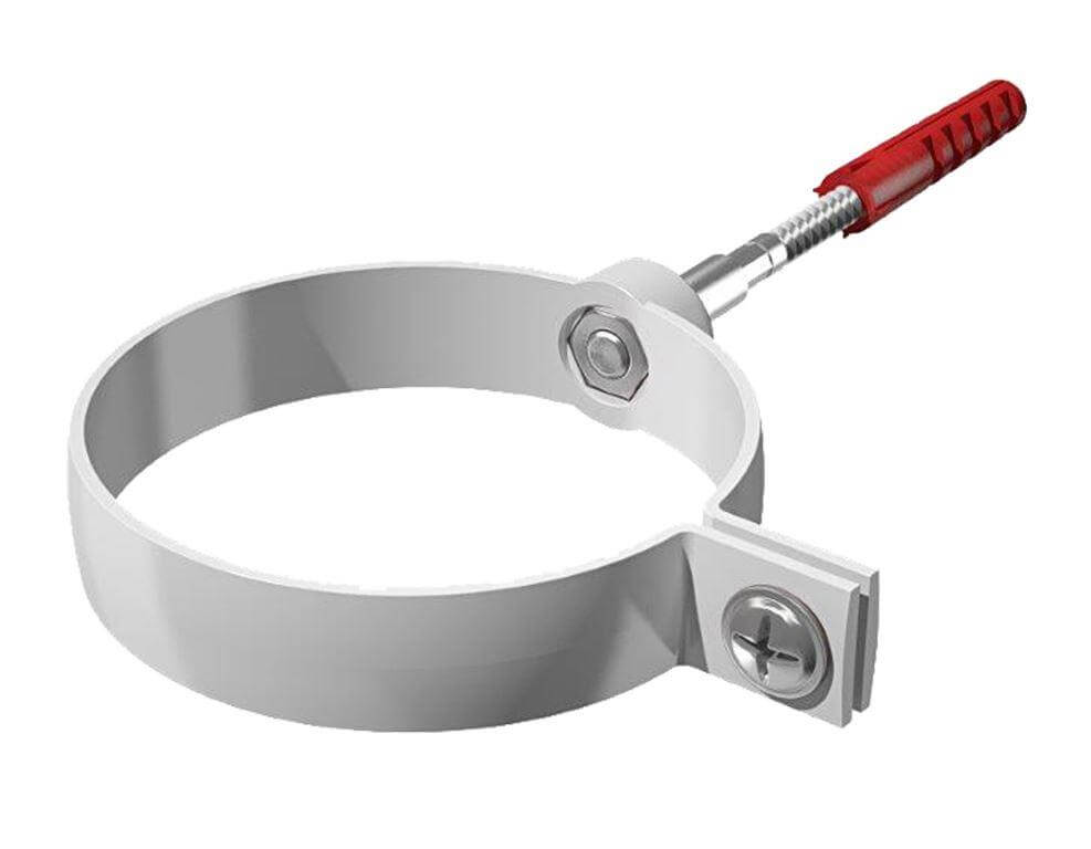 Хомут трубы металлический для ПВХ ТЕХНОНИКОЛЬ 125/82, с дюбелем L=140 мм, белый